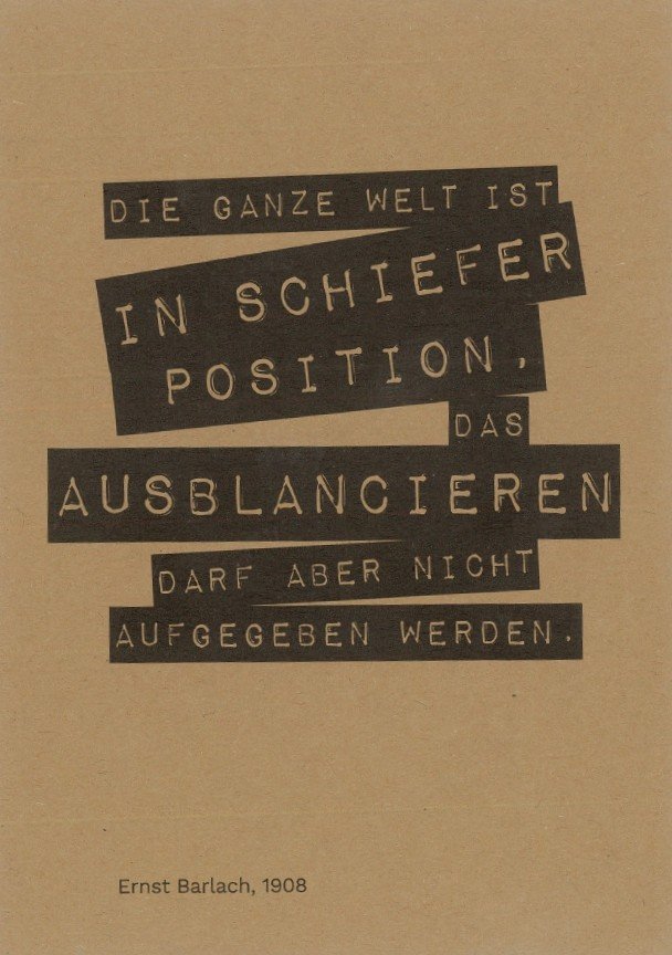 Motiv: „Die ganze Welt ist in schiefer Position. Das Ausbalancieren darf aber nicht aufgegeben werden. (c) Ernst Barlach Stiftung | Format: A6 (10,5 x 14,8 cm) | gedruckt auf umweltfreundlichem Papppapier